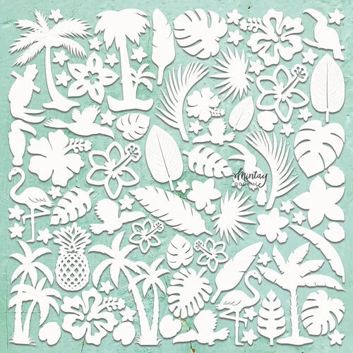 Transform your paper crafting projects into a tropical paradise with the Embellishments Chippies Tropical from Mintay Papers. This sheet showcases 2mm thick, light chipboard designs that are ready to be personalized with paint, ink, or covered with paper (all sold separately). Whether you're creating cards, scrapbook pages, tags, or journals, these versatile chippies will add a touch of exotic charm to your creations. With images of tropical leaves, palm trees, birds, and more, your projects will come to life with a vibrant and tropical vibe. Upgrade your crafting game and let your imagination run wild with these delightful embellishments.